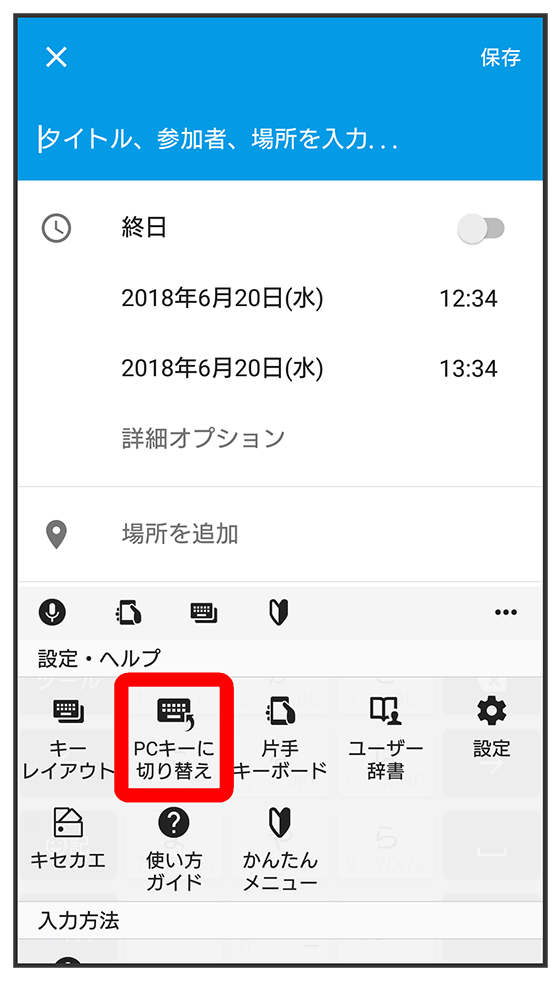 - をタップすると、PCキーボードに数字段を追加するかどうか、またはフリック入力を可能にするかどうかを設定できます。