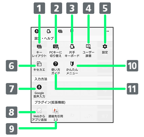 ツール一覧を表示すると、ソフトウェアキーボードやGoogle音声入力の切り替え、プラグインアプリ(拡張機能)の利用、設定の変更などができます。