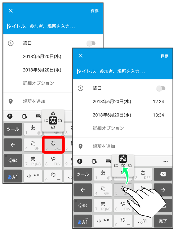キーを上下左右にフリックすることで、キーを繰り返しタップすることなく、入力したい文字を入力できます。キーに触れると、フリック入力で入力できる候補が表示されます。入力したい文字が表示されている方向にフリックすると、文字が入力されます。