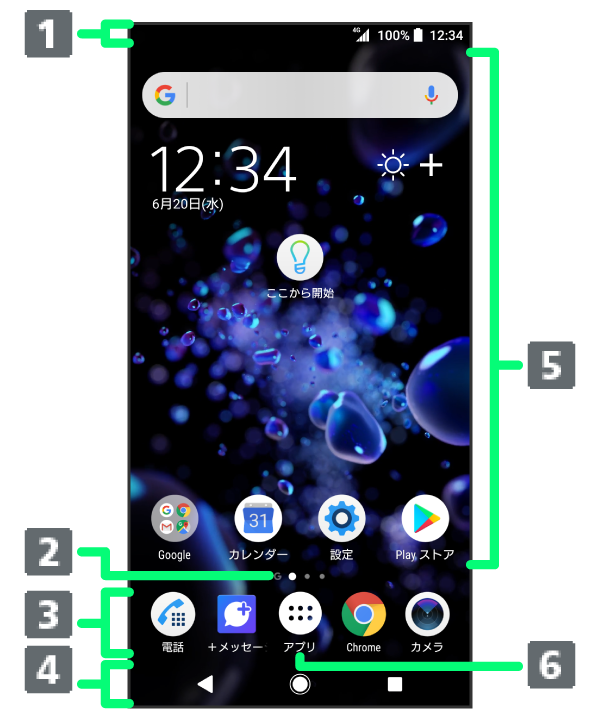 | カスタマイズエリア | アプリのショートカットやフォルダ、ウィジェットを自由に配置できます。 |