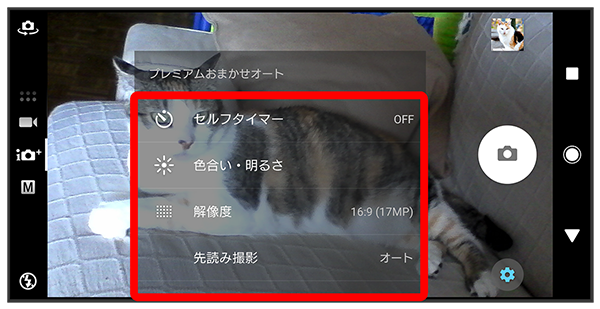 | 先読み撮影(「プレミアムおまかせオート」設定時のみ) | 被写体の動きや笑顔を検出した際に、動きに応じてシャッターを切る直前の写真を保存するかどうかを設定します。 |
