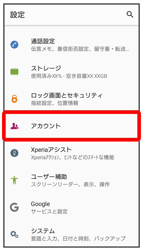 アカウント画面で、同期するアカウントをタップ同期する項目をタップ- 同期する項目をタップするたびに、設定(