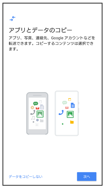 - Google アカウントを設定しているほかの端末からデータをコピーする場合は、をタップして、画面の指示に従って操作してください。