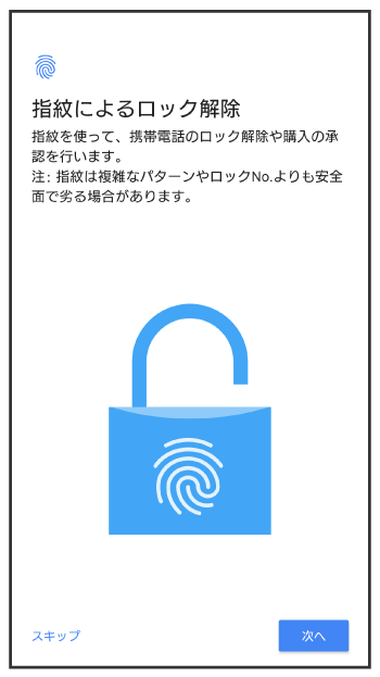 - 予備の画面ロックは、本機を再起動した後や指紋が認識されなかった場合などに必要となりますので、忘れないようにご注意ください。