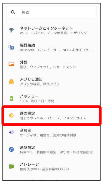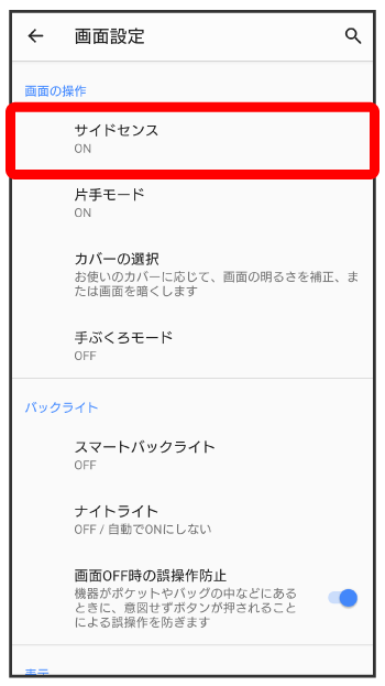 | 感度調整 | ・ダブルタップの速さ サイドセンスが認識するダブルタップの速さを設定します。 ・スライドの長さ ひとつ前の画面に戻るスライド操作の長さ(認識する距離)を設定します。 |
