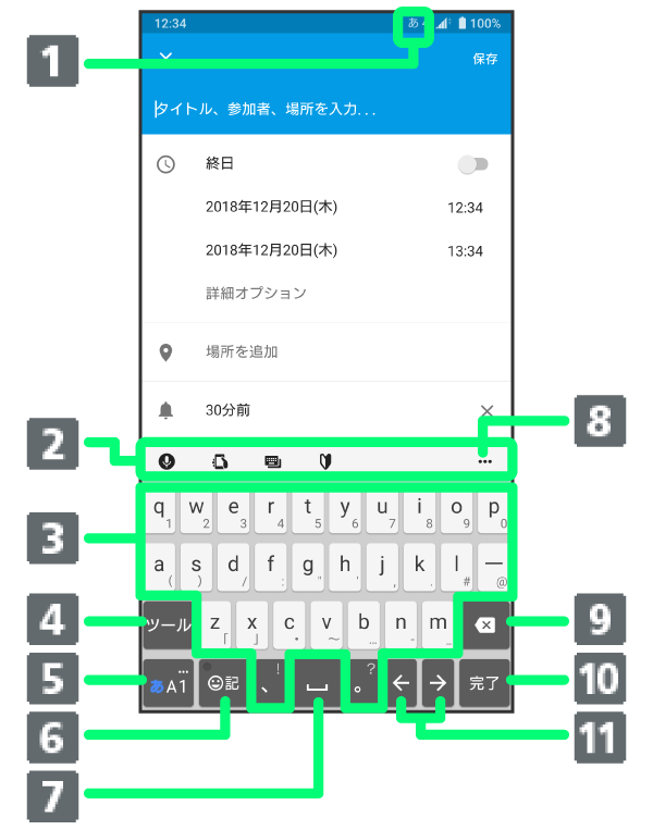 - 文字入力モードを切り替えます(かな/英字/数字)。ロングタッチするとツール一覧を表示します。