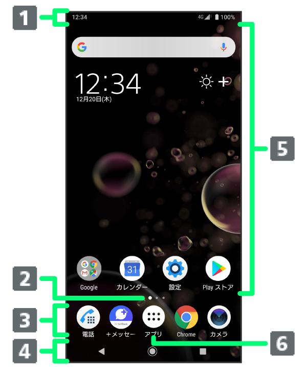 | ドック(Dock)メニュー | アイコンをタップすると、アプリや機能を起動できます。お好みのアプリのショートカットを最大4つまで設定できます。フォルダを設定することもできます。 |