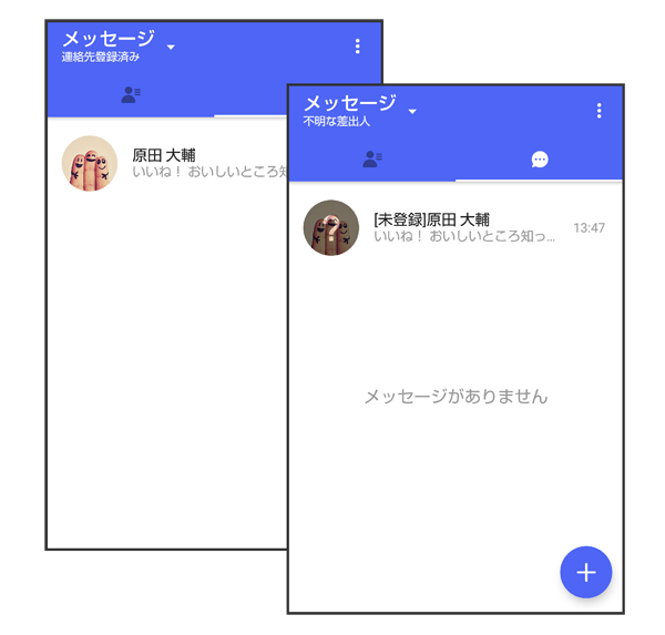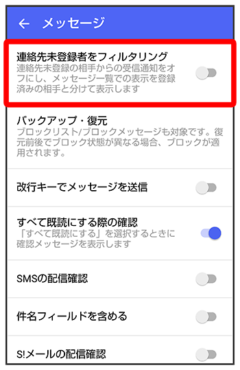 連絡先に登録していない差出人からのメッセージを、連絡先に登録している差出人からのメッセージと分けて表示するかどうかを設定します。