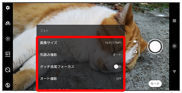 - 「フォト」「マニュアル」のアウトカメラ撮影時のみ設定できます。