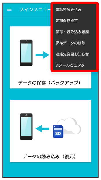 | 定期保存設定 | 本体の電話帳、カレンダー、発着信履歴、画像、音楽、動画のデータを、サーバー/SDカードに定期的に自動で保存します。詳しくは、「定期的に自動で保存する」を参照してください。 |