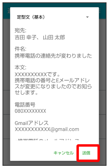 - /をタップすると、本文に電話番号/Gmailアドレスを記載するかどうかを設定できます。タップするたびに、有効(