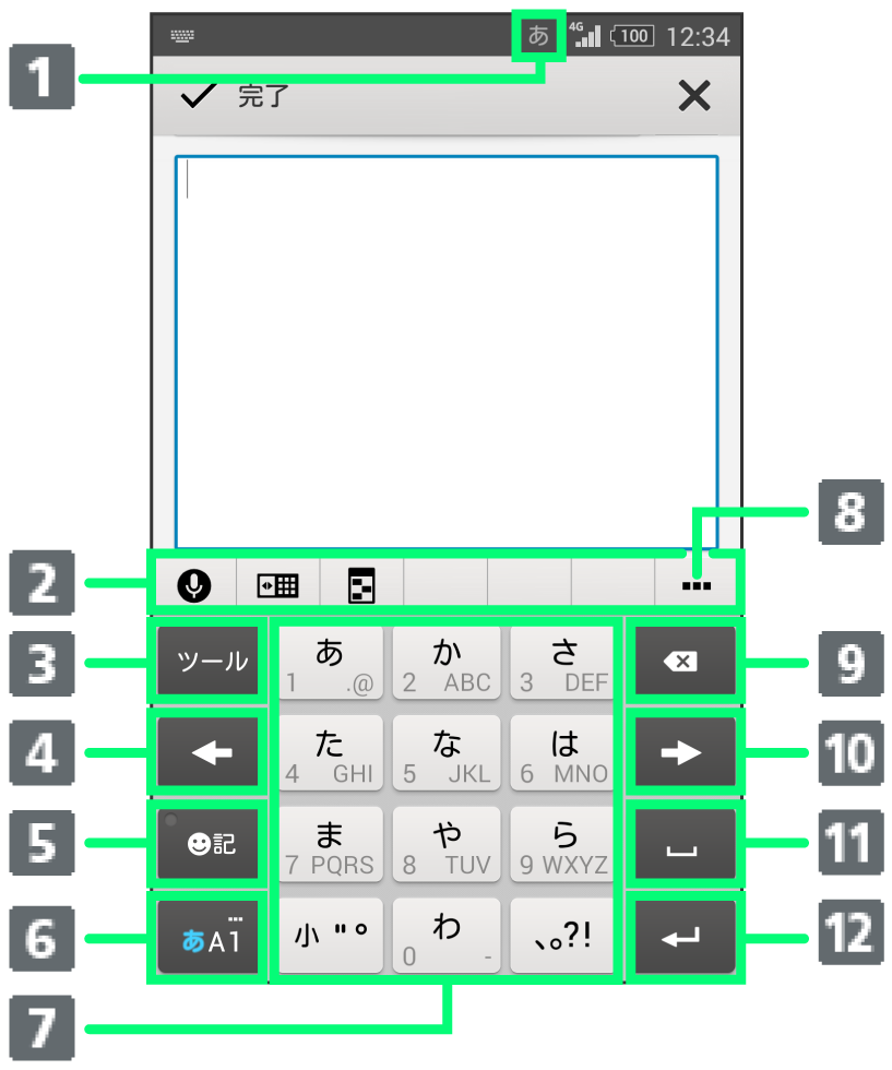 携帯電話と同じ配列のキーボードです。キーを繰り返しタップして文字を選択するトグル入力に加えて、フリック入力もできます。