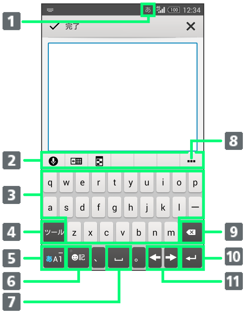 をタップすると、クイックツールバーを表示/非表示にします。英字入力中は、大文字/小文字を切り替えます。数字入力中は全角/半角の切り替え、および入力できる記号を切り替えます。- 入力文字モードを切り替えます(ひらがな/英字/数字)。ロングタッチするとツール一覧を表示します。