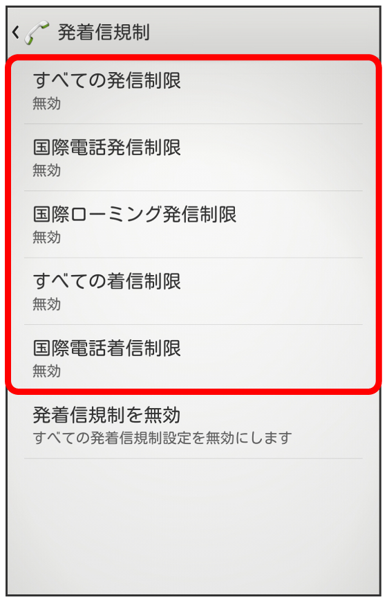 - 発着信規制をすべて無効にするときは、をタップして交換機用暗証番号(発着信規制用暗証番号)を入力し、をタップします。