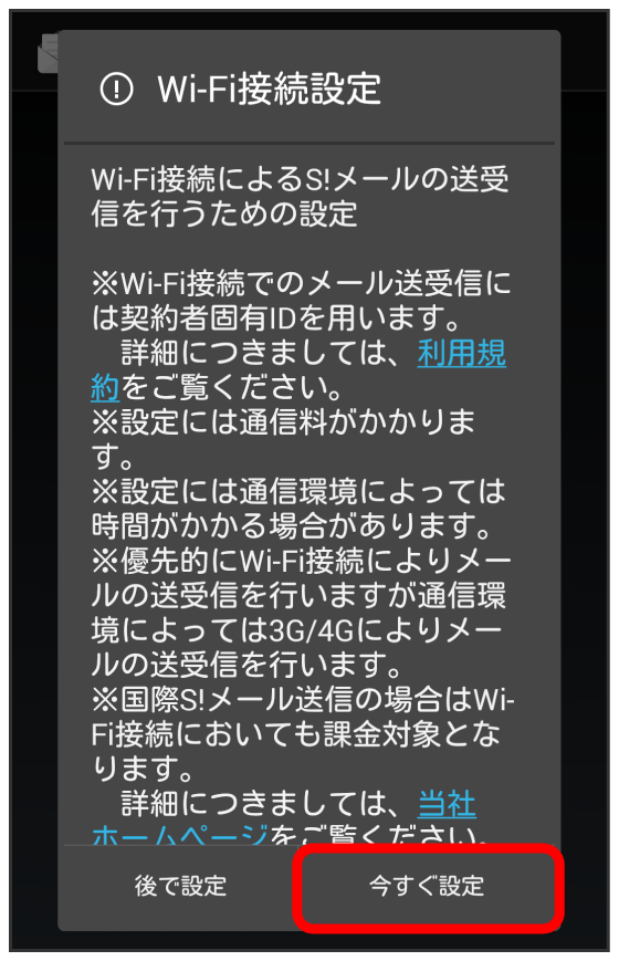 メールを初めて起動したときは、Wi-Fi利用時にS!メールを送受信するための設定と、