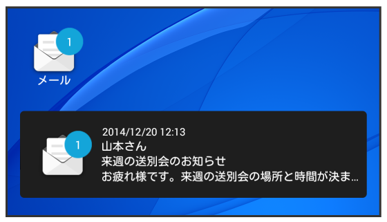 ウィジェットを利用すると、ホーム画面からメールの情報を確認できます。ウィジェットには簡易版(画面上部)と詳細版(画面下部)があります。簡易版では、未読メール数を確認できます。詳細版では、未読メール数に加えて最新の未読メールの日時や、本文の一部も確認できます。未読メールがない場合は、最新のメールの内容が確認できます。