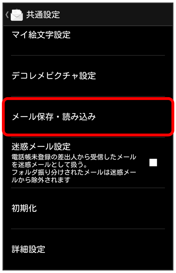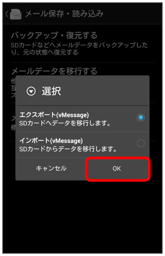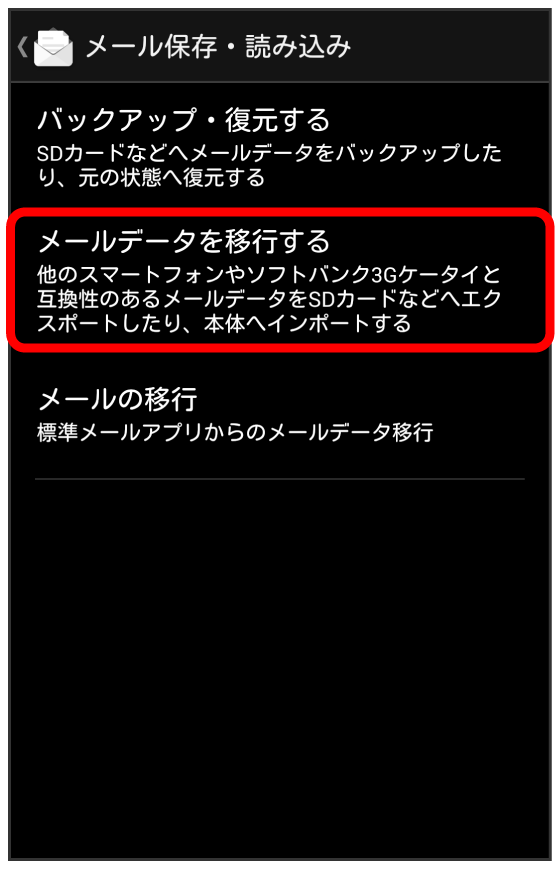 本体のメールデータをvMessage形式でSDカードなどにエクスポートします。vMessage形式は、ほかのスマートフォンやソフトバンク携帯電話(3G)と互換性があります。