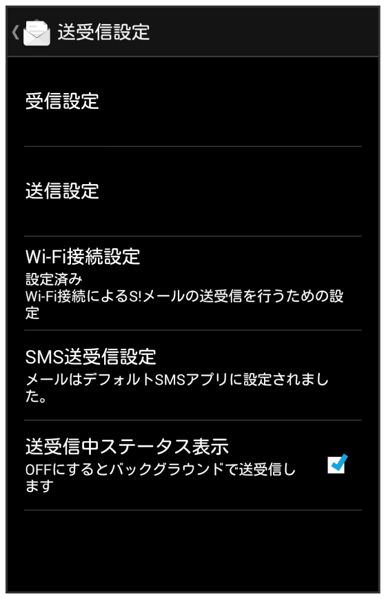 | Wi-Fi接続設定 | Wi-Fi接続でS!メールを送受信するための設定を行います。 |