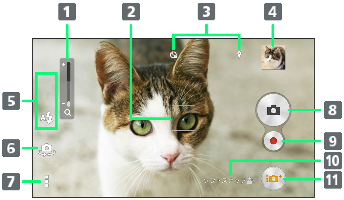 - サムネイル:タップすると、撮影した静止画や動画の再生画面が表示されます。