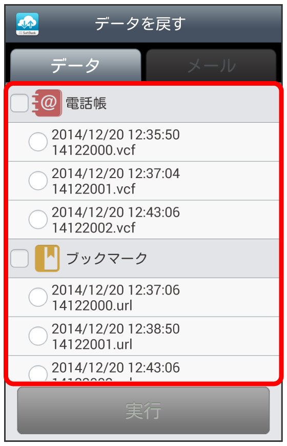 サーバー/SDカードなどに保存した電話帳データ/ブックマークデータ/カレンダーデータ/発着信履歴データ/画像データ/音楽データ/動画データから、データを選択して本体に戻すことができます。