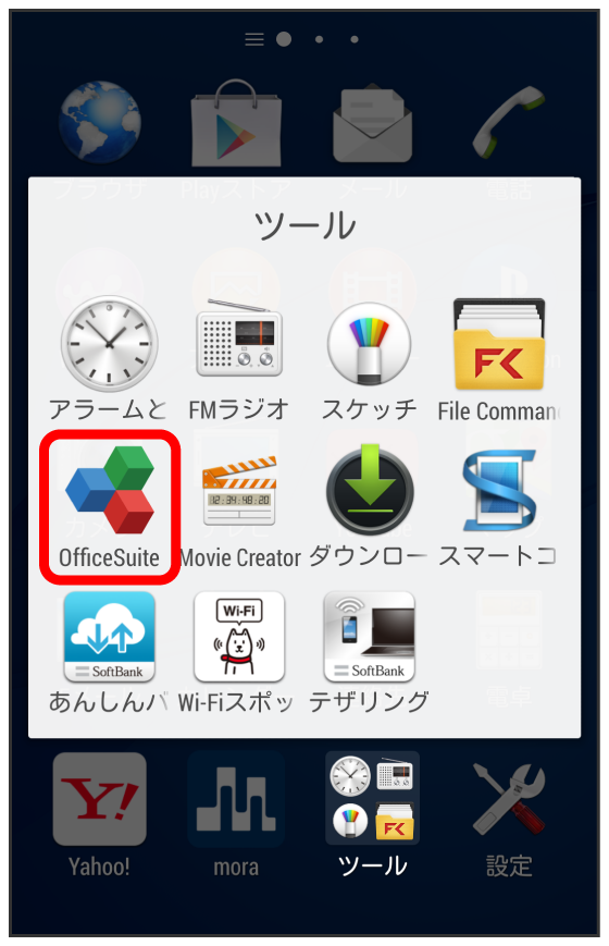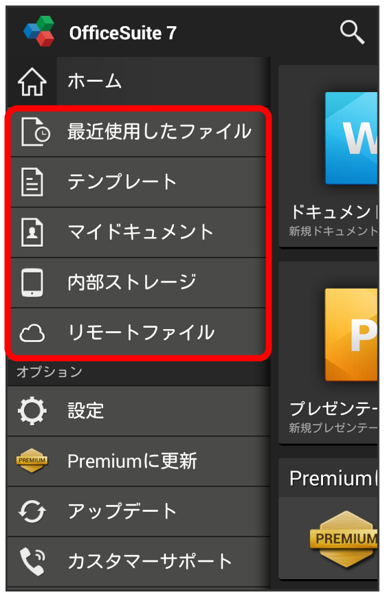 OfficeSuite画面の左端を右にフリック表示するファイルの保存先をタップ