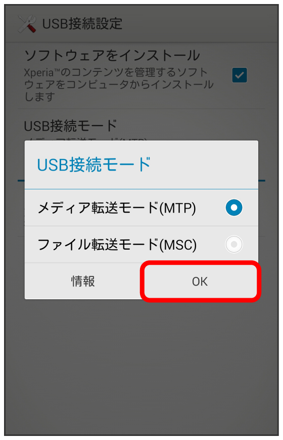- を選択したときは、画面内の注意事項を確認してをタップします。「ファイル転送モード(MSC)」に切り替えてパソコンに接続しているときは、本機側でSDカードにアクセスできなくなります。そのため、「カメラ」「アルバム」などのアプリケーションで、SDカードを使用する機能が利用できない場合があります。