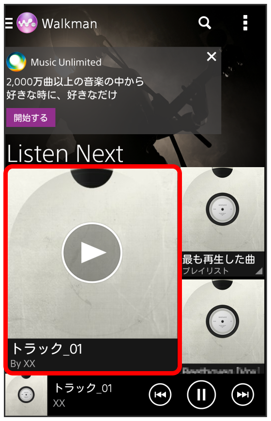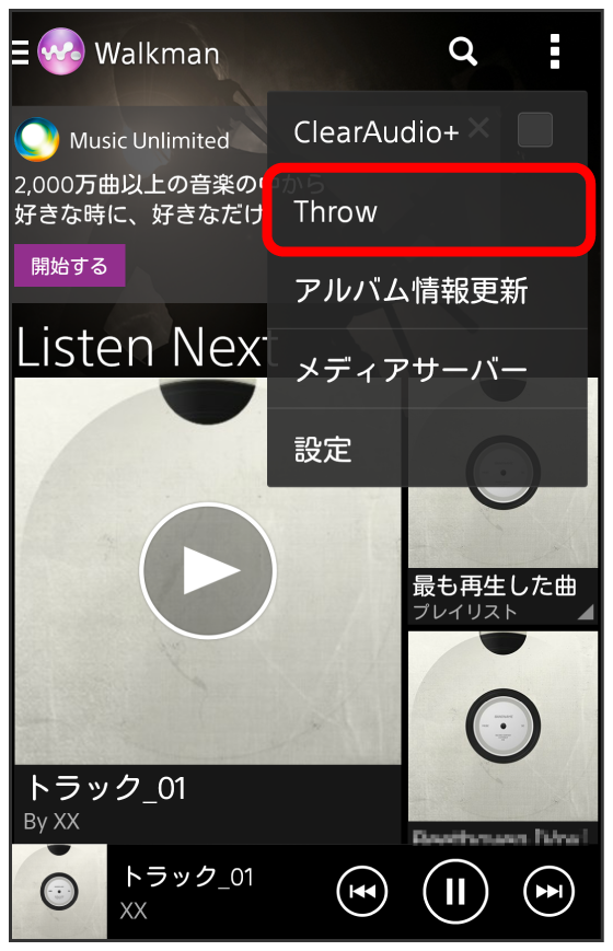 Throw機能を使って、本機のメディアファイルをDLNA機器で再生することができます。「Walkman」アプリケーションを使った操作を例に説明します。