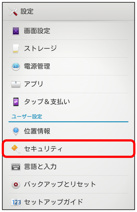 画面ロックやSIMカードロックなど、セキュリティに関する設定ができます。設定できる項目は次のとおりです。