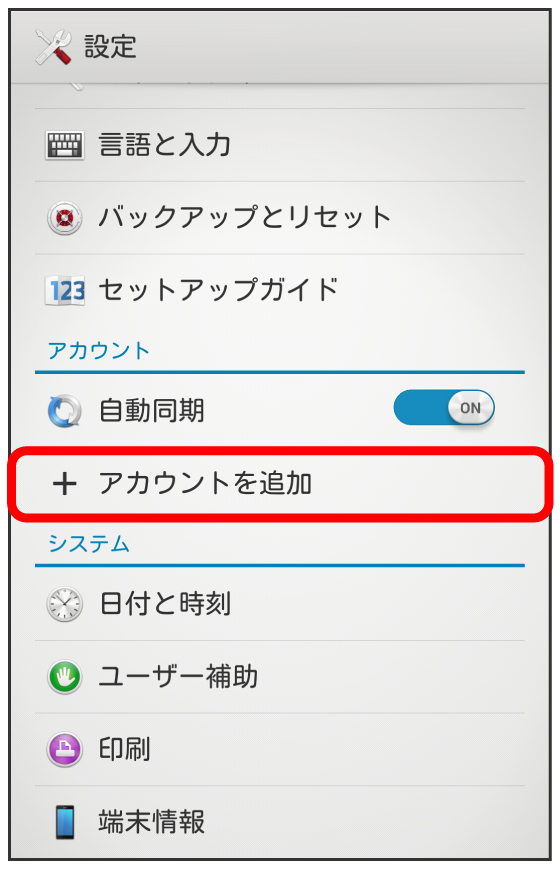 設定するアカウントをタップアカウントをタップ同期する項目をタップ- 同期する項目をタップするたびに、設定(