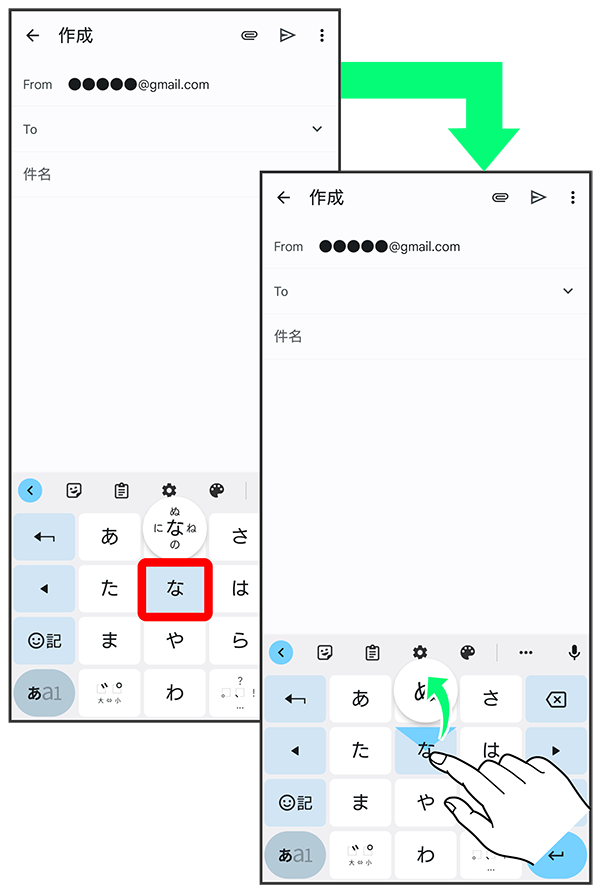 キーを上下左右にフリックすることで、キーを繰り返しタップすることなく、入力したい文字を入力できます。キーに触れると、フリック入力で入力できる候補が表示されます。入力したい文字が表示されている方向にフリックすると、文字が入力されます。