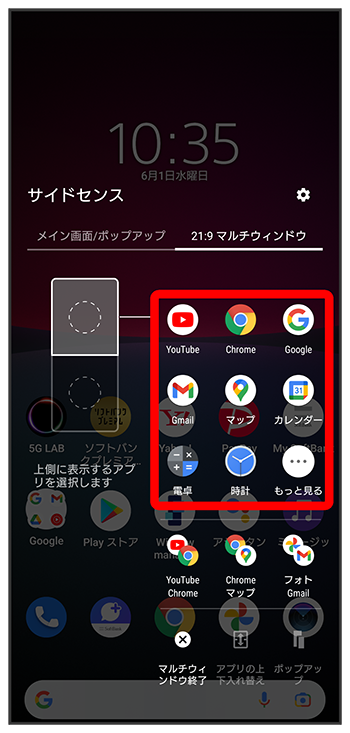 - サイドセンスバーをダブルタップと操作してもマルチウィンドウメニューを表示できます。