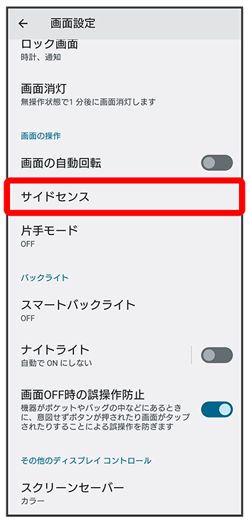 | ジェスチャー操作感度 | サイドセンスバーが認識するダブルタップ操作の速度や、スライド操作の長さを調節します。 |
