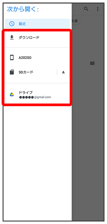 - SDカードはSDカードを挿入している場合、Google ドライブはGoogle アカウントを設定している場合に表示されます。