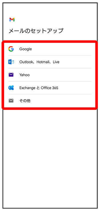 Gmailを利用するには、Google アカウントまたはeメールアカウントの設定が必要です。
