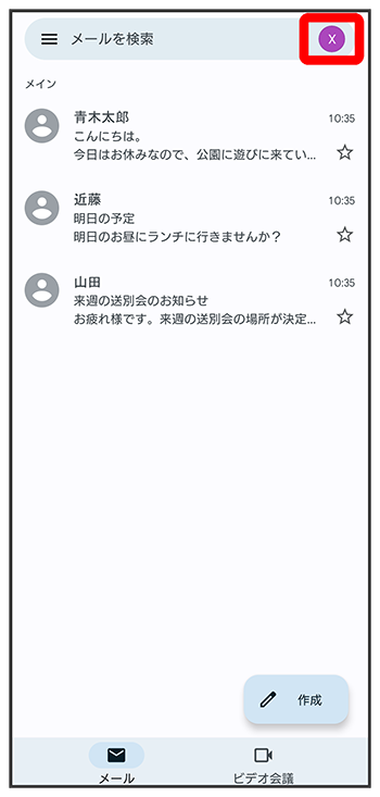 メール一覧画面でアカウントのアイコンをタップ切り替えたいアカウントをタップ