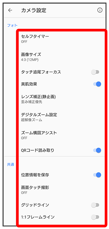 - 「フォト」「ビデオ」のメインカメラ撮影時のみ設定できます。