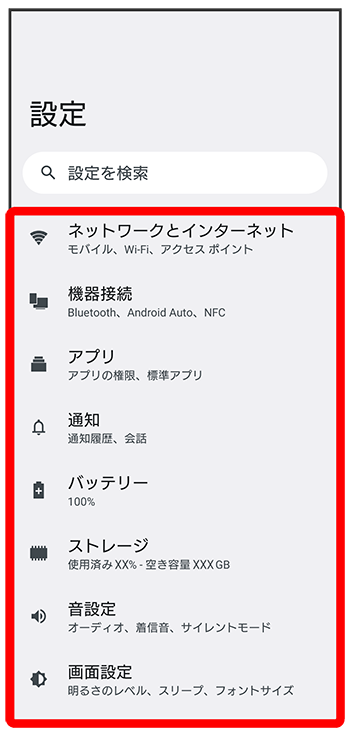 | 機器接続 | Bluetooth接続やNFC/おサイフケータイ®設定など、ほかの機器との接続に関する設定ができます。 |