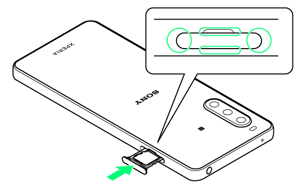 - ○部分をしっかりと押し、本体とSIMカード/SDカード挿入口のカバーにすき間がないことを確認してください。