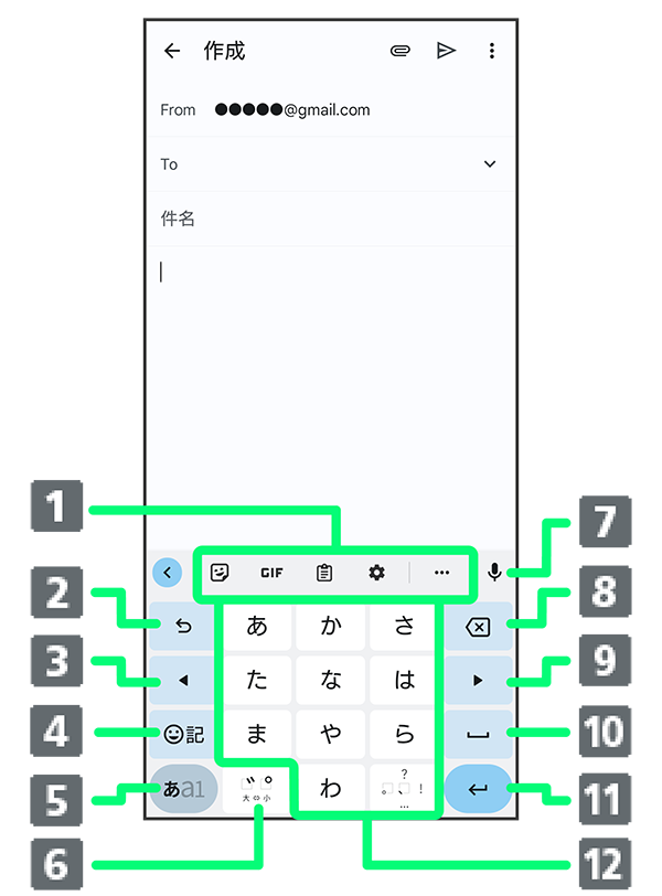 - 文字入力モードを切り替えます(かな/英字/数字)。ロングタッチすると文字入力の設定画面を表示したり、片手モードを設定したりできます。