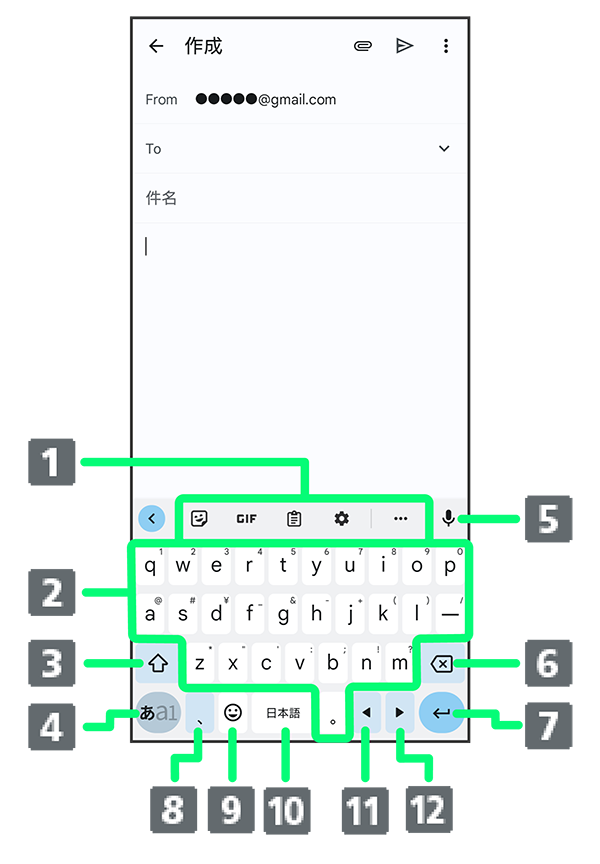 などが表示されます。 - 読点を入力します。ロングタッチすると文字入力の設定画面を表示したり、片手モードを設定したりできます。