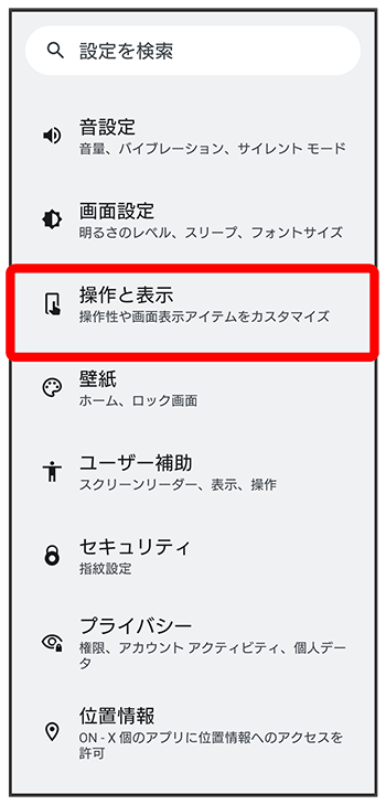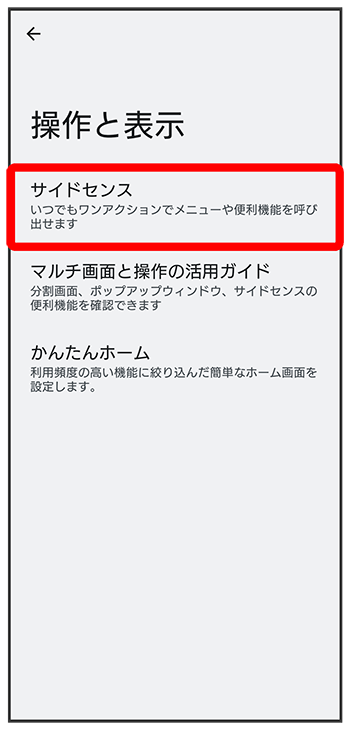 | ジェスチャー操作感度 | サイドセンスバーが認識するダブルタップ操作の速度や、スライド操作の長さなどを調節します。 |