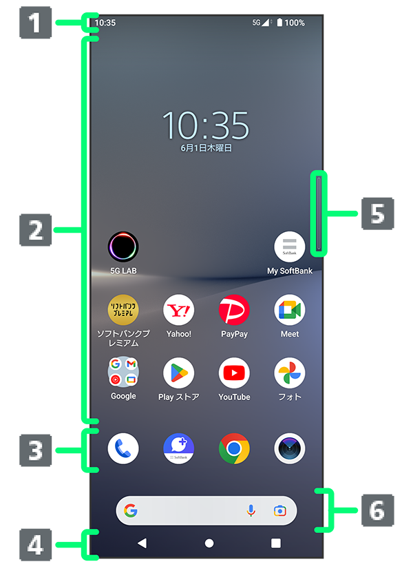 | カスタマイズエリア | アプリのショートカットやフォルダ、ウィジェットを自由に配置できます。 |