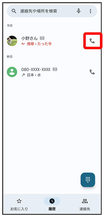 通話履歴画面で対象の通話履歴の名前/電話番号をタップ通話履歴を削除する