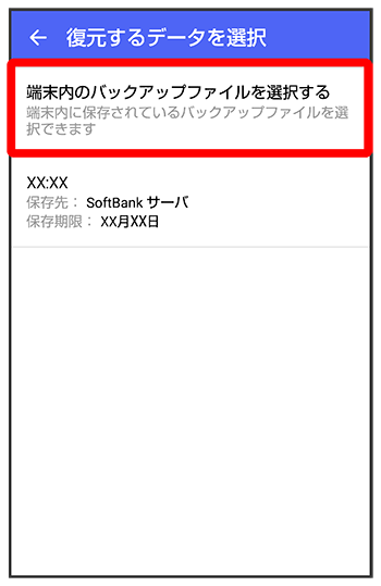 - バックアップしたデータが表示されている場合は、内部ストレージ/SDカード/Google ドライブからバックアップデータを選択し、手順