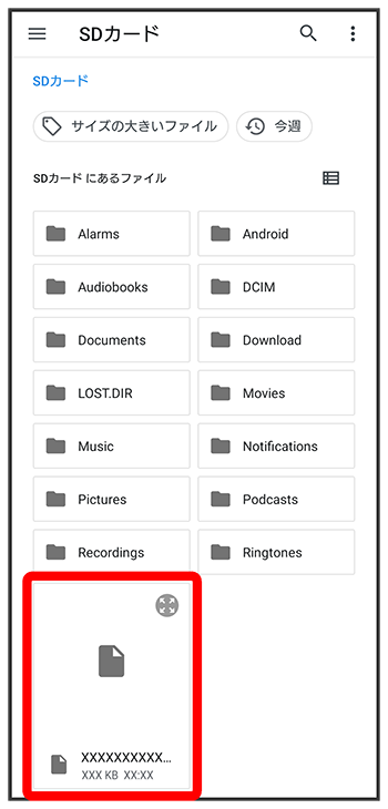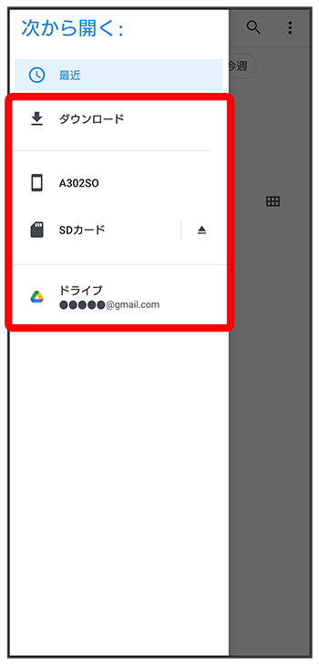 - SDカードはSDカードを挿入している場合、Google ドライブはGoogle アカウントを設定している場合に表示されます。