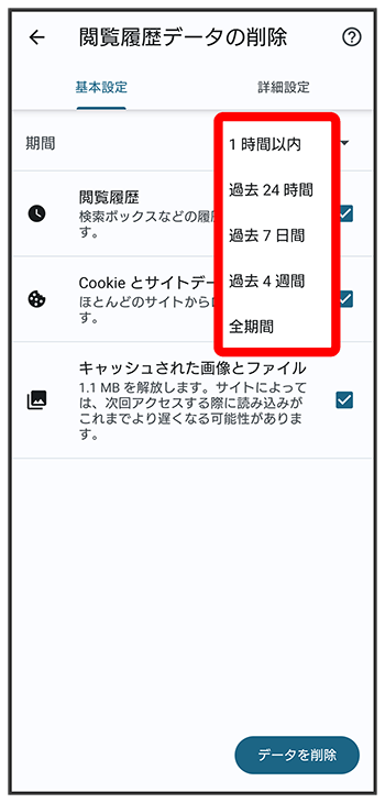 閲覧履歴データの削除画面が表示されます。