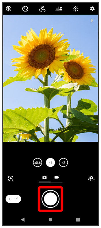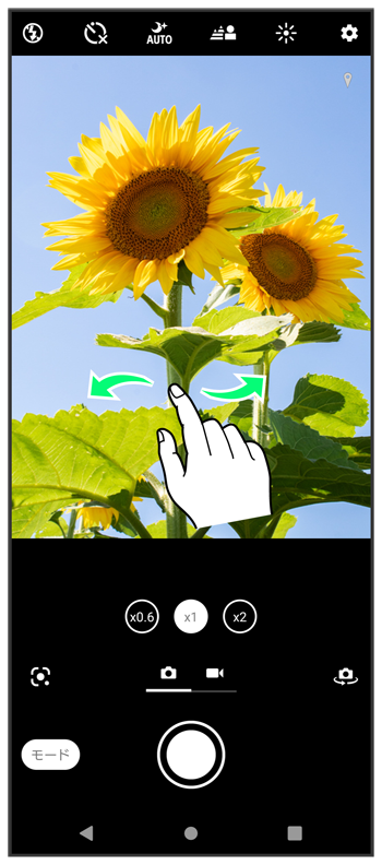 (望遠レンズ))をタップすると、レンズが切り替わり、ズームインジケーターが表示されます。アイコンを左右(横画面の場合は上下)にドラッグするとズームを利用できます。 - 音量キーの操作は、「音量ボタン設定」により異なります。お買い上げ時は「ズーム」に設定されています。