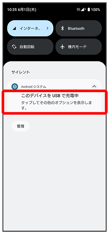 ステータスバーを下にフリックUSB接続モードを選択