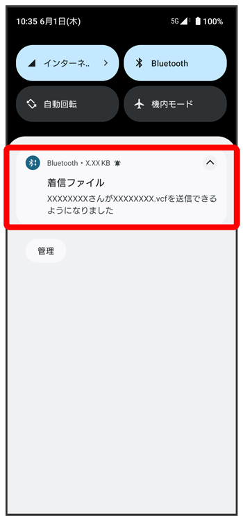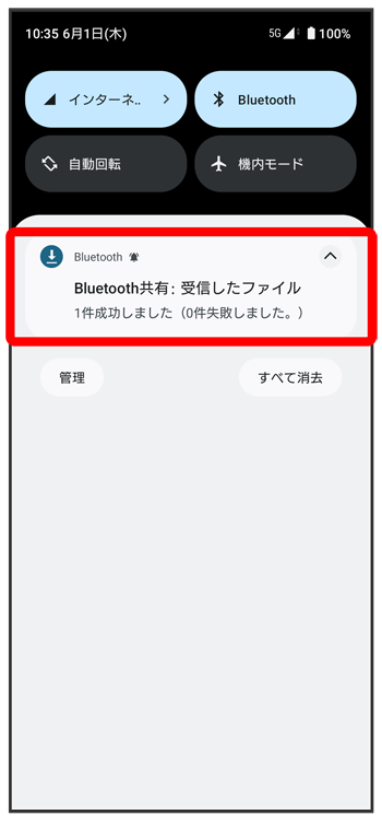 受信完了後、ステータスバーを下にフリックファイル受信の通知をタップ