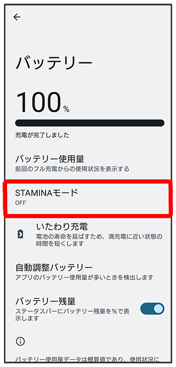 に変わります。また、ダークモードが有効になります。 - と操作すると、設定した電池残量に応じてSTAMINAモードをONにするように設定できます。